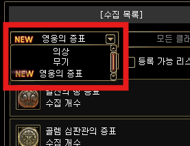 등급별로 분류된 다양한 의상 및 무기 코스튬, 영웅의 증표를 수집하면 수집 개수에 따라 능력치 보너스가 적용됩니다.
