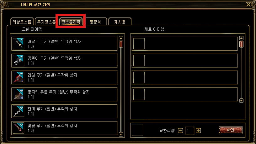 배달국 무기 (일반) 무작위 상자 무기코스튬 합금 500 몬스터 처치 무기코스튬 용제 3 떠돌이 명예 상인 NPC 구매 5,000,000