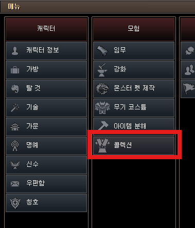 설정 (단축키 ESC)를 눌러 전체 메뉴에서 [콜렉션]을 이용할 수 있습니다.