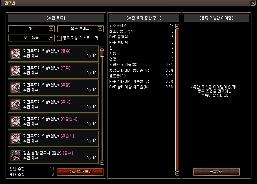 [수집 효과 종합 정보]는 등록한 의상/무기 코스튬 수집 수에 맞춰 획득한 능력치가 합산되어 표기됩니다.