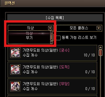 [수집 목록] 내 의상/무기를 선택하여 코스튬 종류를 변경할 수 있습니다.