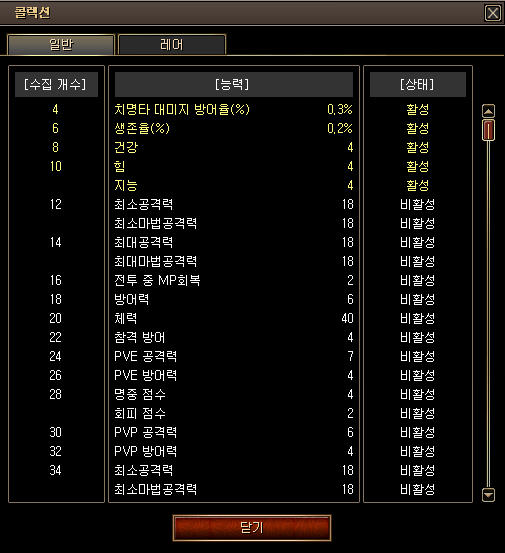 [수집 효과 보기]를 통해 코스튬 수집에 따른 능력치 활성 상태 및 비활성화 상태를 확인할 수 있습니다.