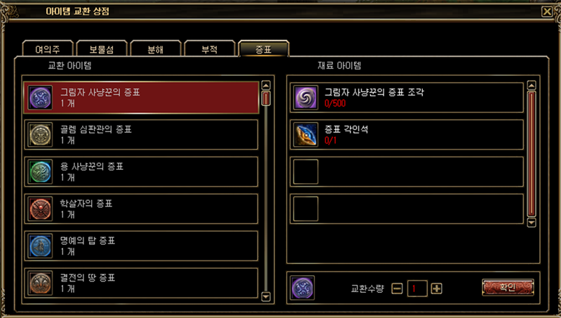 | 그림자 사냥꾼의 증표 | 1 | 그림자 사냥꾼의 증표 조각 | 500 | 증표 각인석 | 1 |