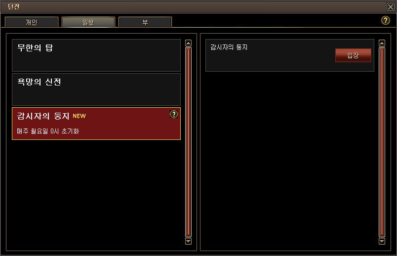 감시자의 둥지는 기존 인스턴스 던전과는 다르게 제한된 조건으로 플레이하는 일행형 던전입니다.
